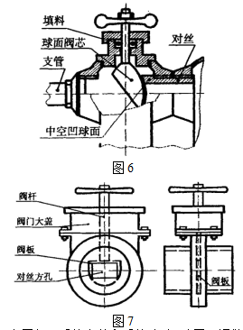 這種可調節(jié)散熱器的關鍵部位是三通閥部分(或調節(jié)閥部分)。將散熱器的上部改造為一個三通閥 ,下部作“跨越管” 。如, 可以采用這樣一種做法,將第一與第二片散熱器之間的對絲的一端加工成中空的環(huán)形凹球面, 而將閥桿下部的閥芯加工成斜放的半球 ,旋轉閥芯實現(xiàn)對絲中孔開度大小的變化 ,進而實現(xiàn)熱水流量的調節(jié)(如圖 6)。當然, 閥的結構可以是與此不同的其它形式。