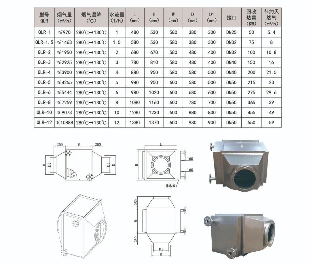 就是配套常規(guī)1噸、2噸到12噸的常規(guī)鍋爐的節(jié)能器,因?yàn)樽龅谋容^多,我們已經(jīng)有常規(guī)的工況數(shù)據(jù)可以給大家參考:案例:2噸燒天熱氣鍋爐,排放的煙氣量約為1950m³/h,排煙溫度為280℃;冷水流量為2T/h,進(jìn)水溫度30℃,出水溫度為75℃左右,總回收熱量為100KW,可節(jié)約天熱氣10.8m³/小時(shí) 按天熱氣3元每立方,每小時(shí)就是30元,按一天開(kāi)14小時(shí)就可以節(jié)約:420元!